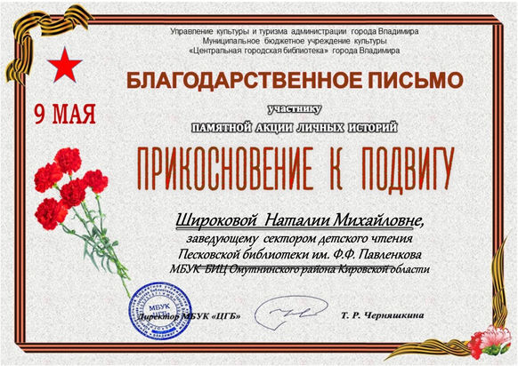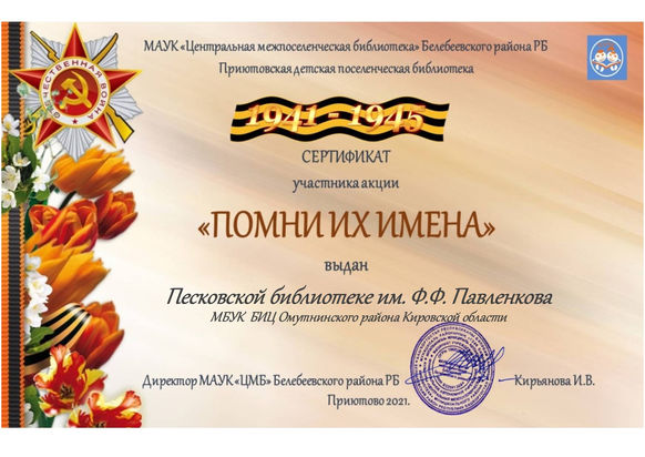 Дипломы и сертификаты участникам из Песковки можно получить в Песковской библиотеке им. Ф.Ф. Павленкова 6 мая: школьники в 11-00, дошкольники в 13-00