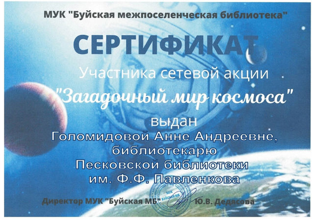 Библиотека приняла участие в открытых сетевых акциях #КосмоЧтение2021, «Притяжение далеких звезд», «Загадочный мир космоса», Первом Космическом диктанте, Звездном диктанте «Поехали!». В Год науки и технологий юные песковчане присоединились к Всероссийской акции «Мечты о космосе», приуроченной к празднованию 60 - летия первого полета Ю.А. Гагарина в космос. В челлендже «Космический костюм», акции «По следам космических героев» ребята с удовольствием позировали в шлеме космонавта, создавали поделки на космическую тематику, рисовали фантастические рисунки.