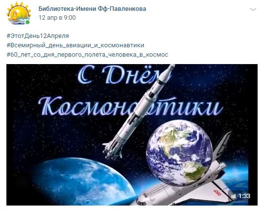 К 60 – летию полёта человека в космос Песковская библиотека им. Ф.Ф.Павленкова организовала ряд мероприятий, посвященных этому зннаменательному событию. На страницах социальных сетей, официальном сайте библиотеки для всех категорий читателей были представлены интересные публикации по данной теме: виртуальная выставка «Эра по имени Гагарин», презентация «Этот день 12 апреля», информина «Знаете, каким он парнем был».